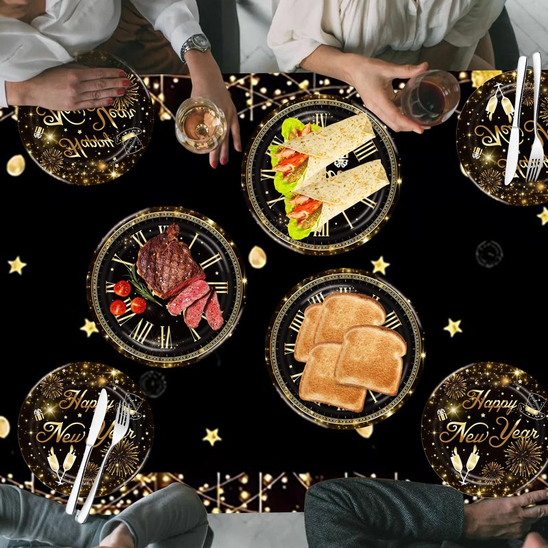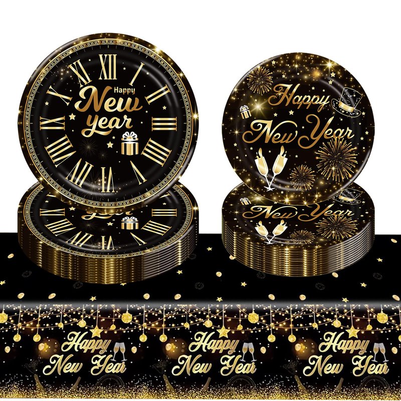 Happy New Year Party Decorations Supplies-Happy New Year Plates and Tablecloth for New Year Celebration Disposable Dinnerware Parties Decoration