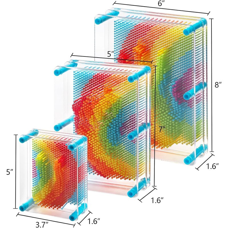 - 3 Sizes: Hacaroa 3 pack pin art sensory toys comes with 3 different sizes. The large one measures 8"H x 6"L x 1.6"W, the medium 7"H x 5"L x 1.6"W, the small 5"H x 3.7"L x 1.6"W.