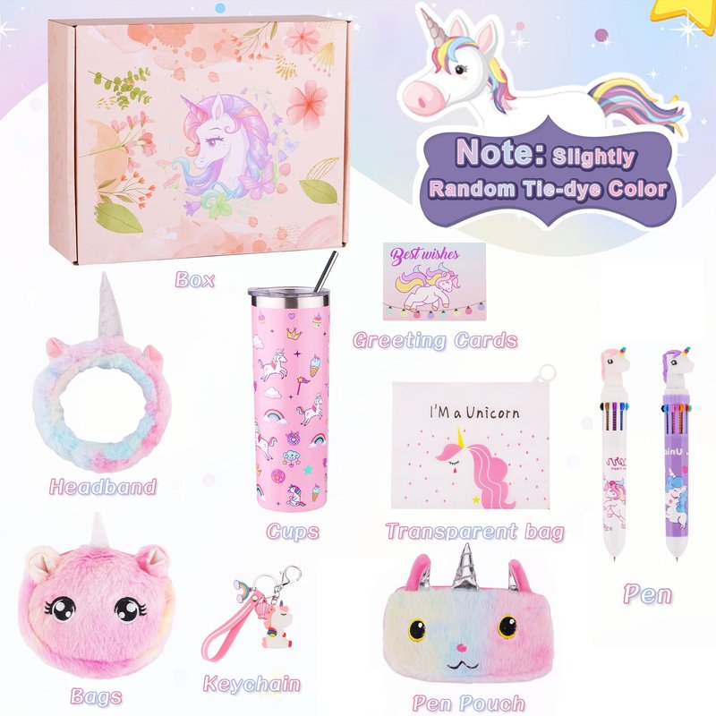 - UNICORNS GIFTS FOR GIRLS : Halloween Unicorn Gift Box is a special and magical gifts for 6-12 years old, including 1 kids water bottle for school, 2 unicorn pen ,1 crossbody bag, 1 Headband,1 unicorn keychain, 1 pencil case, 1 gift card and gift box
