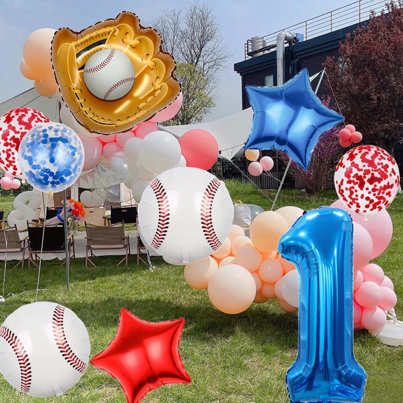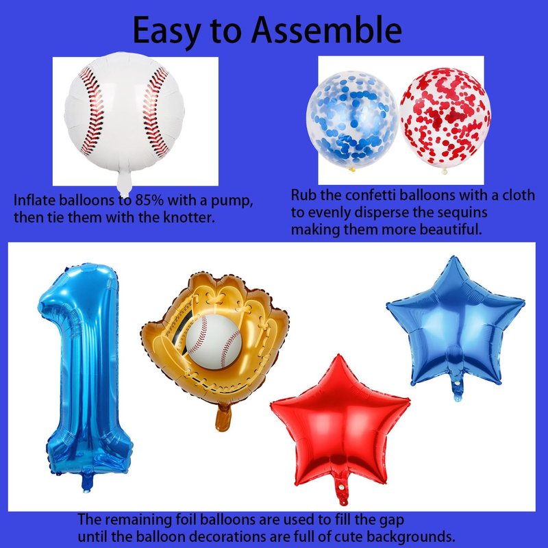 - 【Baseball Themed Decorations】:The baseball balloon set features a fun and very amazing design that is perfect for those looking to add a touch of excitement to their baseball party. The large 1st foil balloon and baseball balloon scheme create a sporting atmosphere, while the red and blue latex confetti balloons and cute red and blue star balloons add a touch of fun. Whether you're hosting a boy's birthday party or a baseball boy's shower is sure to impress your guests.