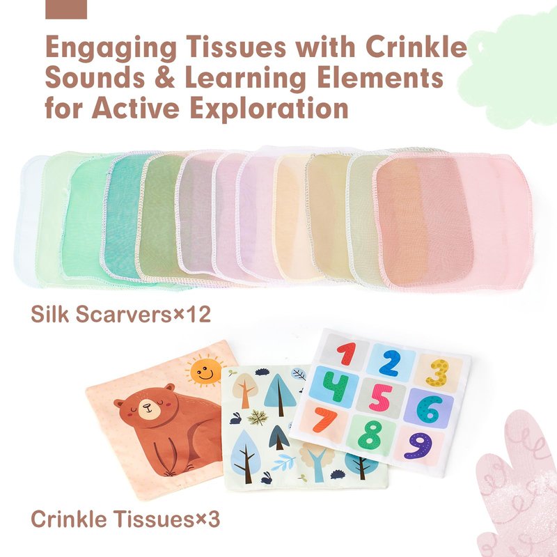 - INCLUDED EVERYTHING BABY WOULD ACTUALLY LOVE - This toy set includes a soft tissue box, 3 different textured & crinkle tissues, and 12 silk scarves. It offers a variety of engaging elements that is an ideal choice for babies over 6 months old. From stimulating fine motor skills to encouraging exploration and early education, this set offers a range of experiences that will captivate and entertain your little one while supporting their development