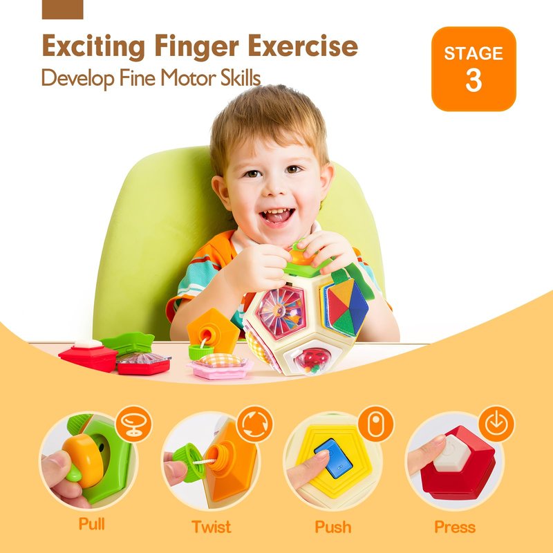 As your child enters the second stage, they'll discover new possibilities and challenges. They can pull the cheerful smiley face, triggering delightful sounds that bring joy and laughter. The ball module offers rolling excitement and auditory stimulation, while the magical fabric module unveils a hidden surprise - a charming ladybug when torn open. The rotating spinner module engages their senses and enhances hand-eye coordination, encouraging curiosity and fostering dexterity.