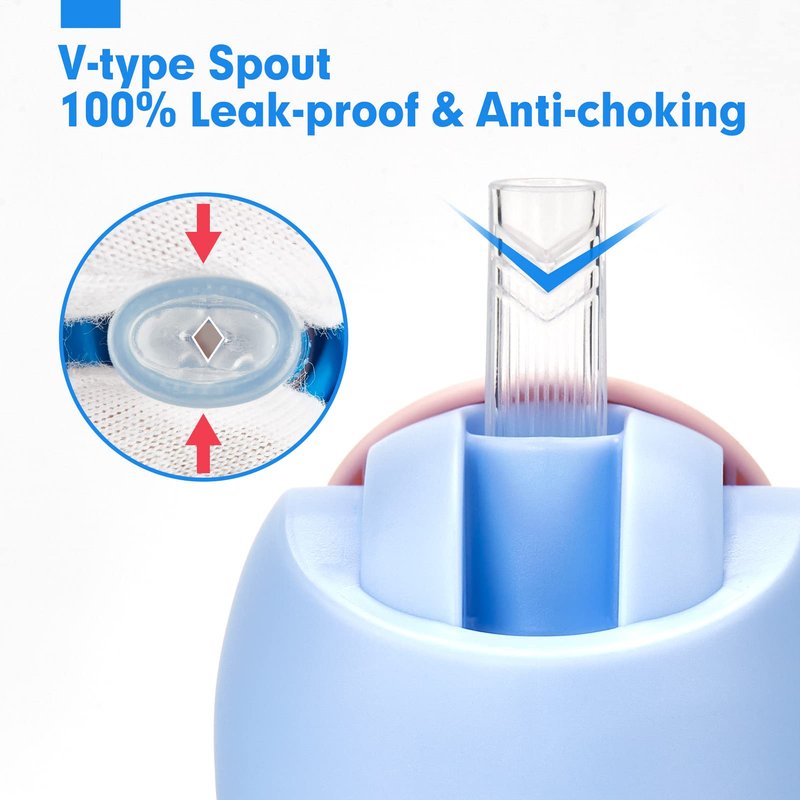 - [100% Leak-proof & Anti-choking] Compared to traditional drinking cups, our sippy cup is designed with V-type, valve cover and water seal ring, will form a sealed state and shut off the flow if the cup is dropped, effectively prevent leaks and avoiding mess, parents don’t need to worry for their kids choking. The spout also features a built-in air vent to help ensure your baby swallows liquid, not air. The cup includes a cap to help keep the spout clean when you’re on the go.