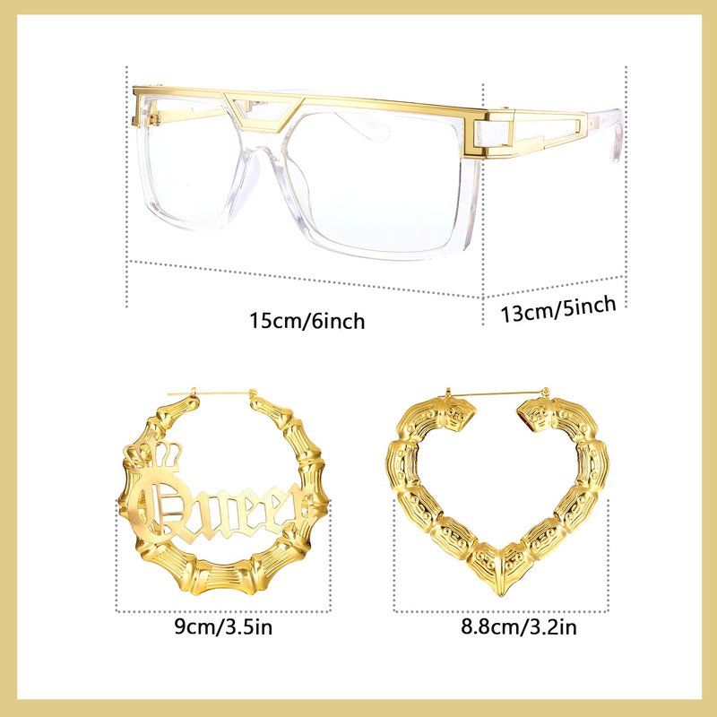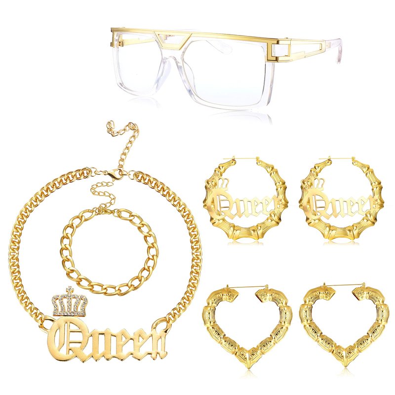 - 💖GREAT PARTY SUPPLIES💖 The hip hop costume kit includes: 1pcs Queen Pendant Cuban Chain Necklace, 2 pairs of Bamboo Hoop earrings, 1pcs DJ rapper glasses, 1pcs gold bracelet, funny costume set for your 80s, 90s dress up.
