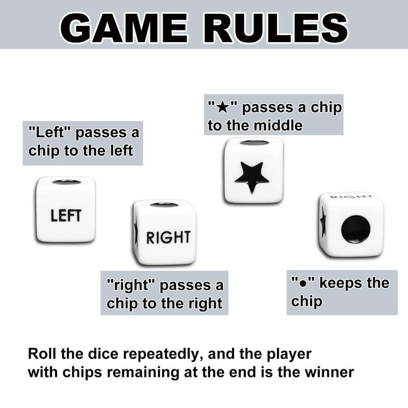 - Simple Game Rules:"Left" means handing the chips to the player on your left; Pass a chip to the left for each “LEFT,” to the right for each “RIGHT,” and to the center for every “★”, Keep chips for "●". Roll the dice repeatedly, and the player with chips remaining at the end is the winner
