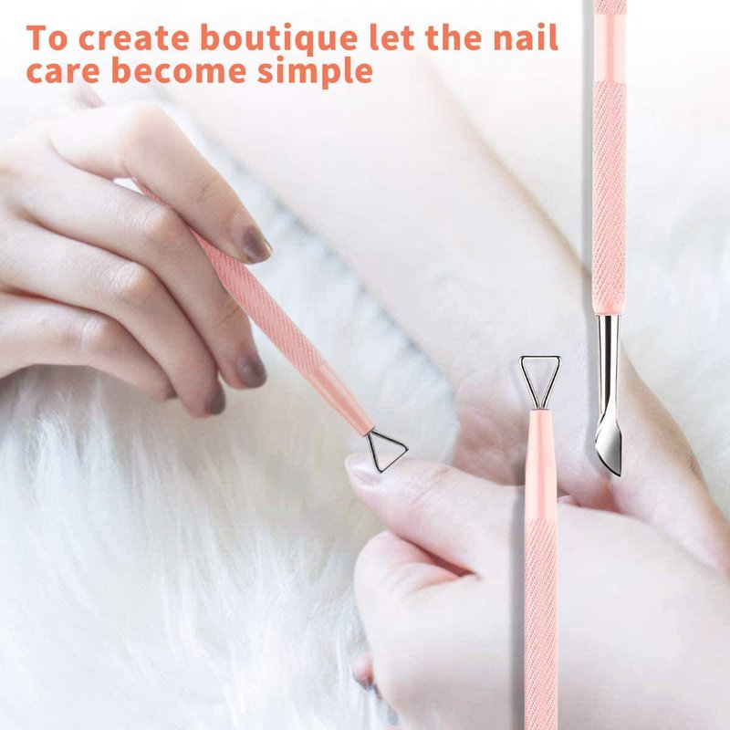 How to Remove the Nail Polish: Step 1:Remove the Nail Polish: Soften the nail polish by applying the remover gel on the nail. Step 2: Wait for about 3 mins the nail polish bursts open. Step 3: Remove the residual nail polish with the triangle pusher. Step 4: Easy to remove the nail polish. How to Remove the Cuticle: Step 1: Submerge the fingers in a small bowl of warm water and soak them for about 3 minutes. Step 2: Use a small towel to gently dry your fingernails. Step 3: Use the cuticle pusher to push back the cuticles on the surface of the nail. Step 4: Use the cuticle nipper or clippers to remove the cuticle (You can also use this sharp tip to clean the dirt under the nails. Repeat this process for all the nails). Features: 100% 410 Stainless Steel Strong and Durable Safety and Health Hypoallergenic Portable for Traveling Ideal foe Home Use or Professional Salon Use Is Used For Removing soak off gel nails Cleaning under nail cuticle of dirt Scraping hard to remove leftover skin Cuticle design and shaping Pushing cuticles