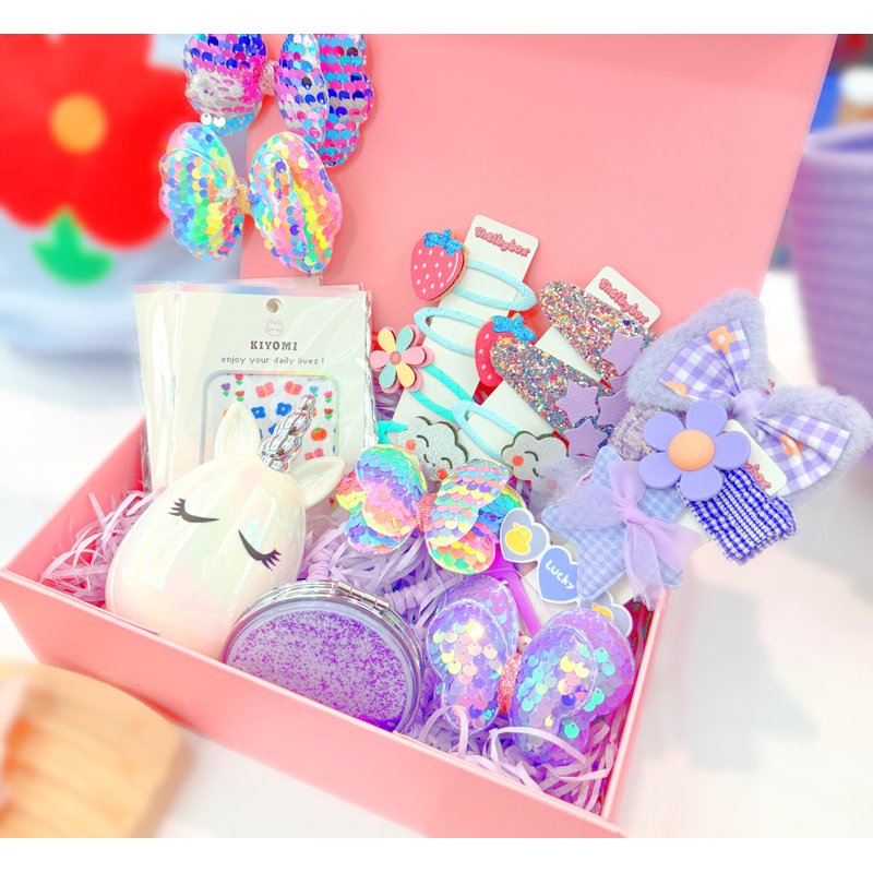 Hair Accessories Gift Set for Kids Purple Hair Clips Barrettes Ponytail Ties Bows Headbands with Mirror Unicorn Comb Gift Box for Daughter Teens Childs Little Girls