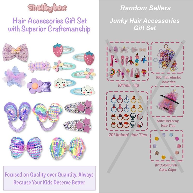 - COLLECTION FOR PURPLE LOVERS - This gift set includes 7 exquisite hair accessories: 3 bow clips, 10 sparkly hair clips, 6 cute hair clips, 2 butterfly hair ties, a mirror, a unicorn-style comb, and 3 pieces of nail tattoos.