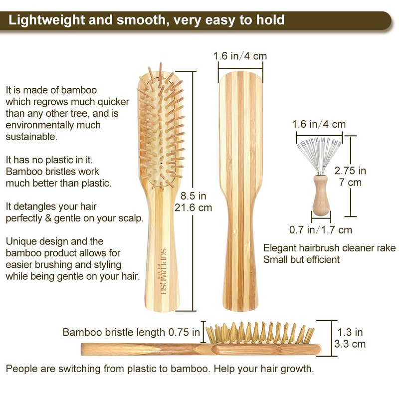 - Unique Design & Eco-friendly – You will get 2 pieces bamboo hairbrush and 1 piece brush cleaner tool. These beautiful hair brushes are made of natural bamboo, even the bristles are 100% bamboo. Not only is it a more sustainable way for the environmental protection by being plastic free, but also a better option for a natural and comfortable using experience while it functions exactly like conventional brushes, perfect for all hair types - dry, straight, coarse, thick, wavy, and curly hair.