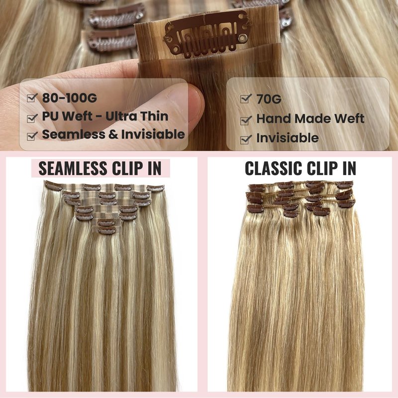 - 【Human Hair Clip in Extensions 7PC 100G】Dirty Blonde Highlighted Platinum Blonde. Valiilo clip in hair extensions are made with a thin silicone-weft base that lays flat against your head and lets you feel more comfortable. Valiilo clip in hair extensions available in 6 lengths: 12'', 14", 16", 18", 20", 22", 7pcs a set with different widths. Usually 1 pack can be used for adding volume, 2-3 packs are recommended if prefer thick hair.