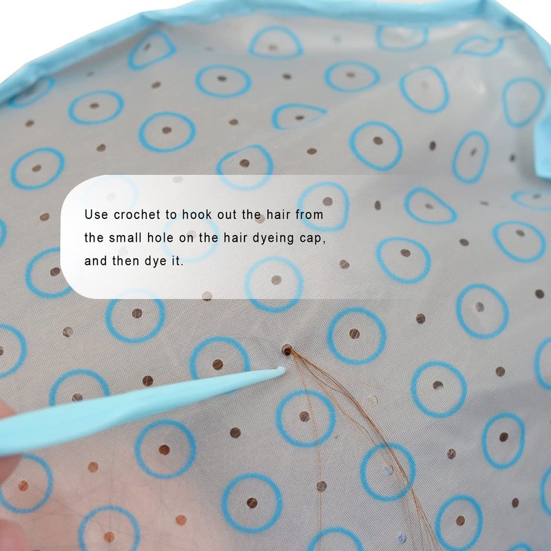 - Easy to use: Wear the cap and tie the attached ties together at the neck for a secure fit, then use the crochet to pierce the hole, pull out the hair to be dyed, and then you can start dyeing.