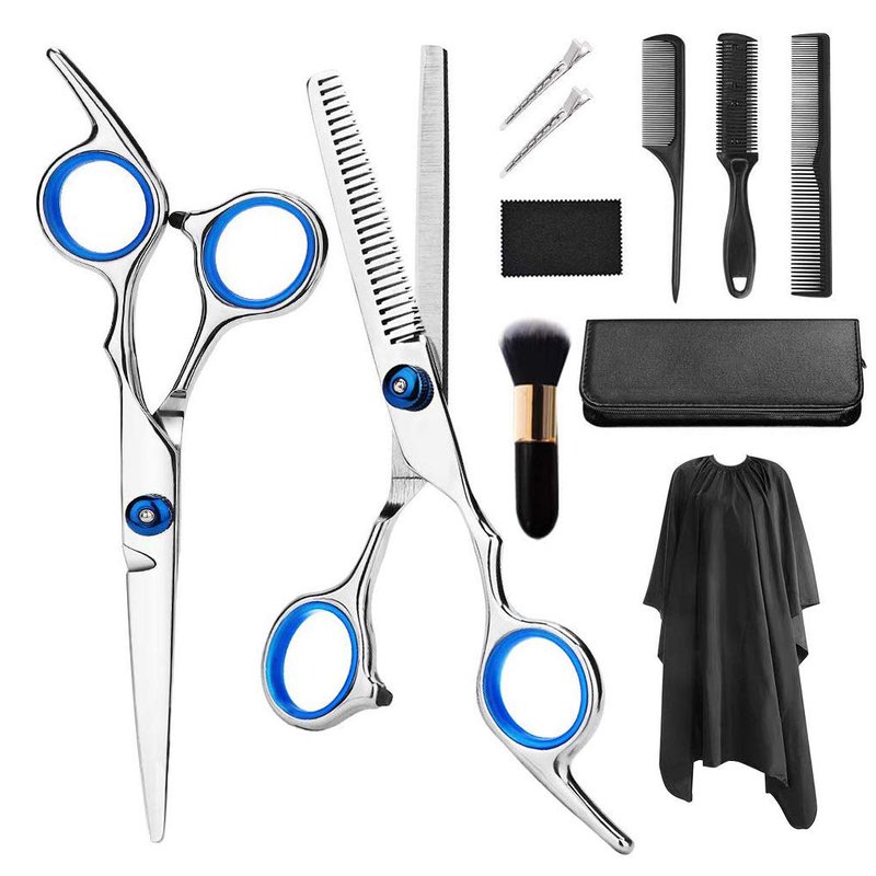 - Hair Scissors:The hair cutting scissors set includes Hair Cutting Scissors 1, Thinning Shears 1, Hair Razor Comb 1, Dressing Hair Comb 2, Clips 2, Barber Cape 1, 1 Hair Sweep Brush, Cleaning Cloth 1, Leather Case 1.