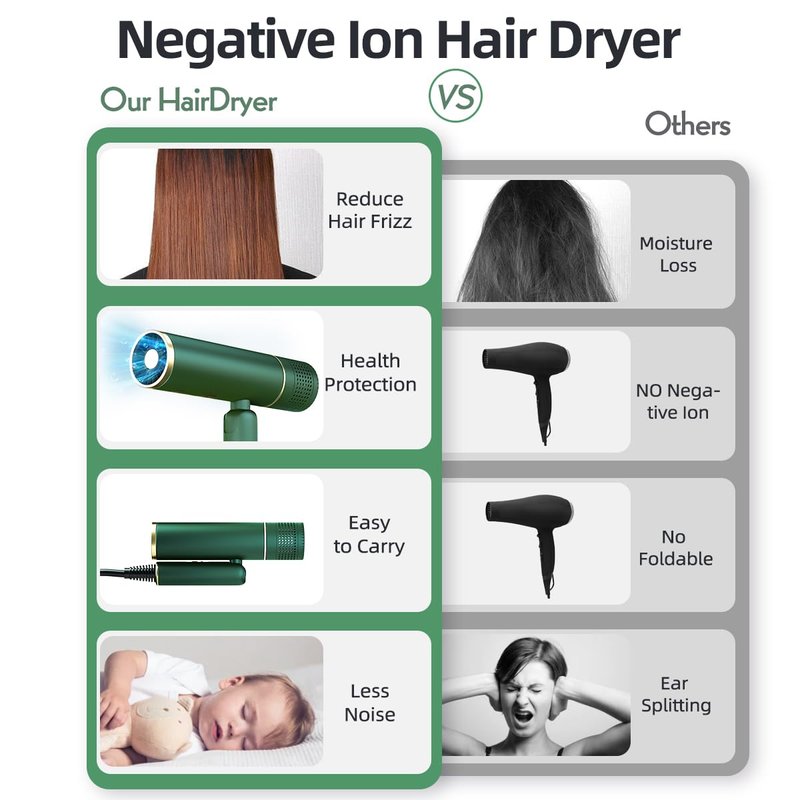- Eliminate Frizz and Take Care of Your Hair Our negative ion blow dryer uses ionic technology to release millions of negative ions to eliminate frizz and add shine as you dry your hair.