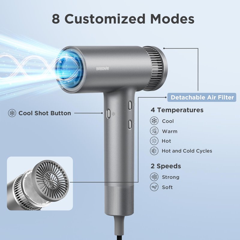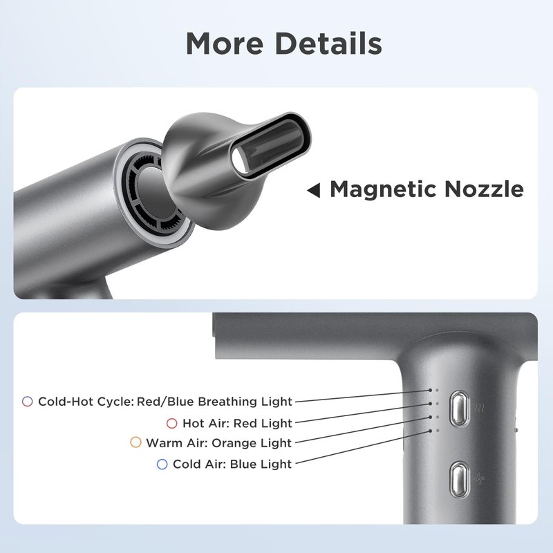 - Customizable Styling: 4 temperatures x 2 wind speeds for up to 8 customizable settings. 360° rotatable magnetic nozzle can achieve a more styling look for sleek, voluminous finish. Unique cool-shot mode sets your hairstyle in seconds