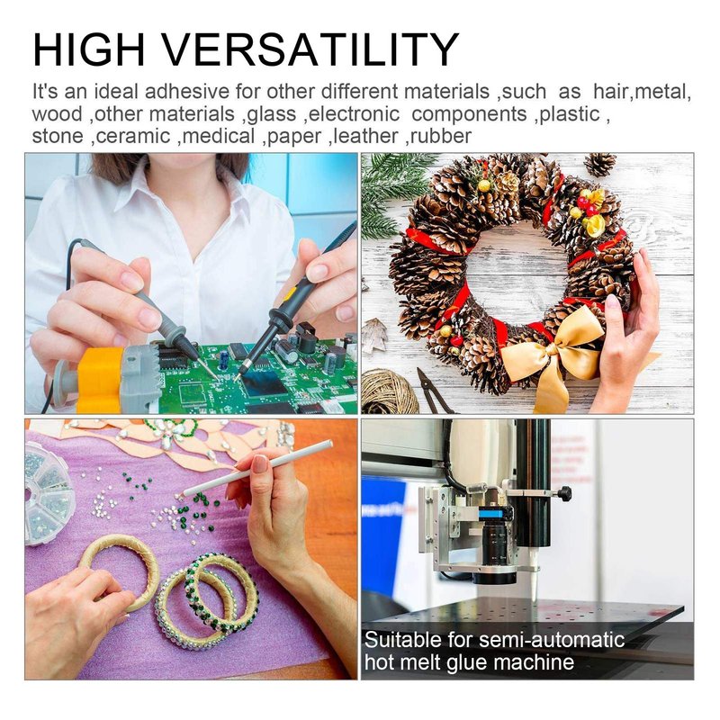 Uses: Multi-purpose, very suitable for bonding heat-sensitive materials, not only for grafted wigs, but also for manuals, accessories, shoes, pearl cotton, wood products, ceramics, toys, cardboard boxes, etc.