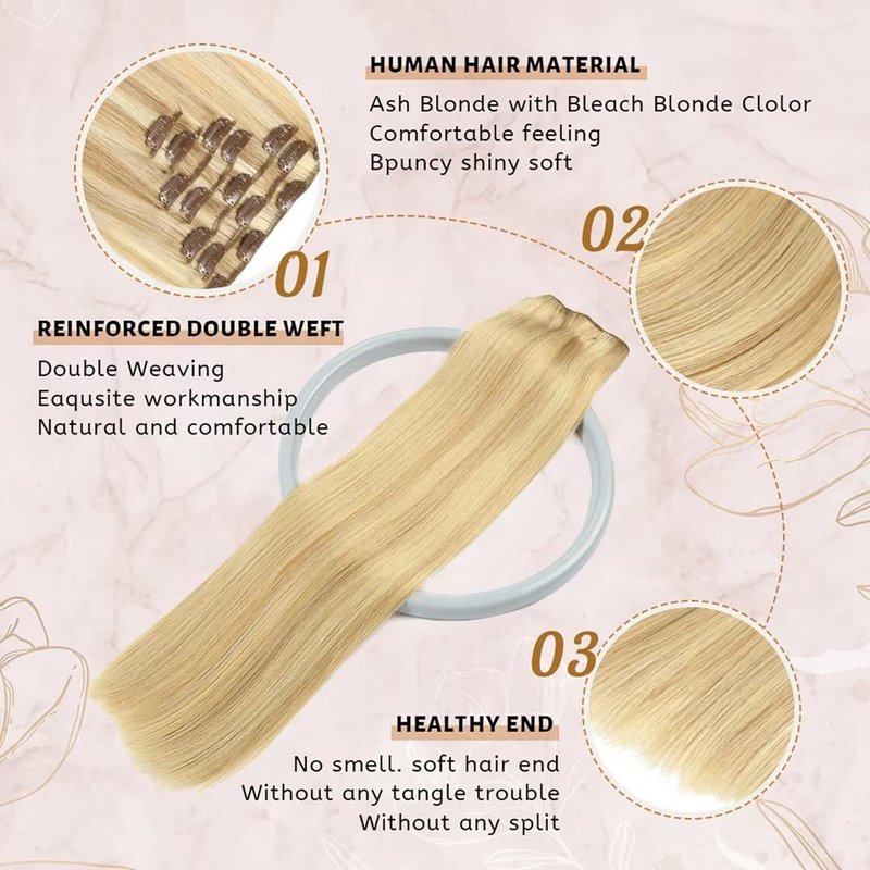 - 【Human hair clip in extensions Details】: 70g/ 7pieces / 16 clips per set. The length for straight human hair clip ins extensions is available from 12 inches to 22 inches. According to your own hair volume, usually 2 packs can fill your full head, increasing length and volume. If you have thick hair, we recommend purchasing more than 2 packs to achieve a perfect result.