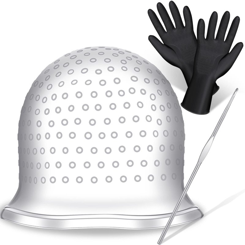 Hair Highlighting Kit Hair Coloring Highlighting Cap with Hook Hair Dye Cap with Gloves Reusable Highlight Cap Silicone Hair Coloring Frosting Pull Through Caps Accessories for Salon Home Hairdressing