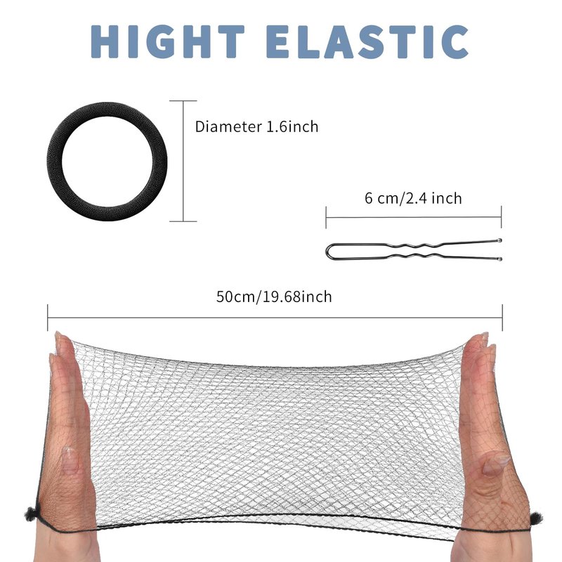 - Package Includes: 30PCS mesh hairnet (5pcs/pack), 30pcs u pins ,5pcs hair elastic bands. The ballet hairnet can stretchable up to 50cm. Hair pins: 2.4inch(6cm).