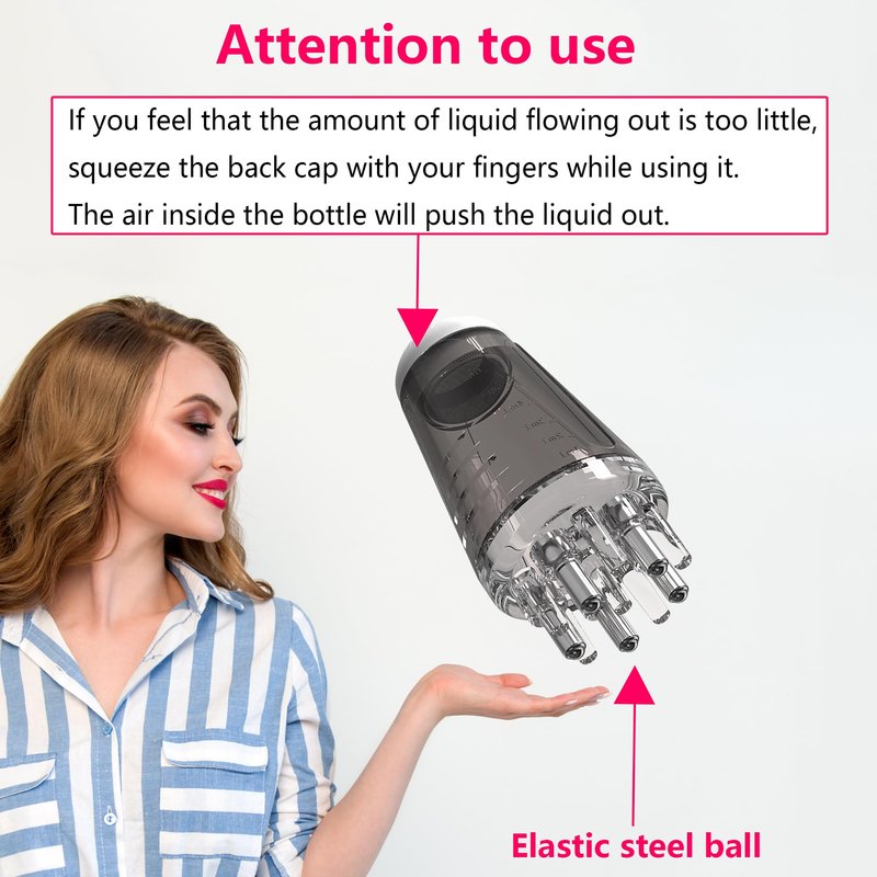 - Usage: Apply the liquid can flow out, if you need to increase the amount of liquid, you can press the soft silicone cap, the gas in the bottle will squeeze the liquid, more liquid