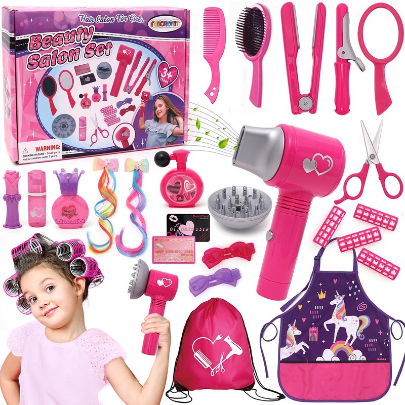 • Girls Hair Salon Toys - Beauty Hair Dresser Salon Kit includes hairdryer with 2 switches, 1 mirror, 4 curlers, 2 combs, 2 hair clips, scissors, mirror, unicorn barber apron, and a storage withdraw bag. With rich accessories and realistic functions of this salon playset fill your child's imagination and creativity and keep them enthralled for hours.