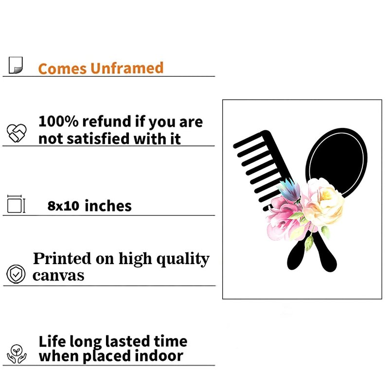 Elevate your home or salon decor with this captivating set of 6 canvas posters featuring stylish hairdressing tools adorned with vibrant floral designs. Each 8"x10" unframed canvas showcases a unique combination of scissors, hair dryers, curling irons, and combs artfully intertwined with lush pink roses, delicate wildflowers, and shimmering golden accents. These eye-catching prints exude a chic, feminine vibe, making them perfect for adorning the walls of your beauty parlor, bathroom, or bedroom. Crafted with meticulous attention to detail, these high-quality canvases are sure to elevate the ambiance of any space and leave a lasting impression on clients and guests alike.