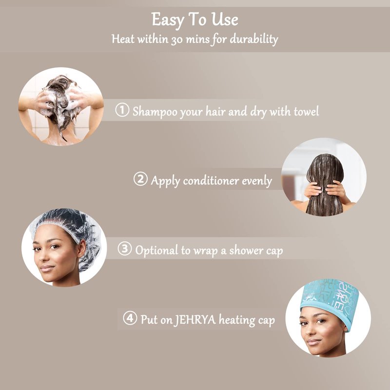 - 【Heat Cap Deep Conditioning Hair Salon】JEHRYA steam caps for black hair is suitable for all hair types to achieve effect of hot oil, hair coloring repair, daily care, etc. After shampoo and conditioner, putting on a shower cap (optional) and the heat cap which can be adjusted the back strap to better fit your head, heating for not over 30 minutes to ensure deep penetration and absorption into your scalp and lift cuticle, effectively prevent split ends with our heat cap for deep conditioning.
