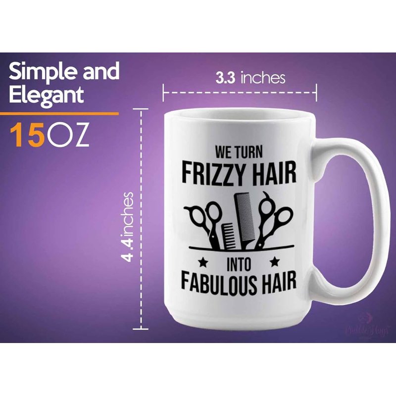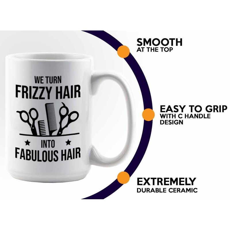 Hair Stylist Coffee Mug 15oz White - Frizzy Hair to Fabulous Hair - Hair Stylist Gift Beautician Hairdresser Salon Barber Hairdo Cosmetoloist Scissors Blower