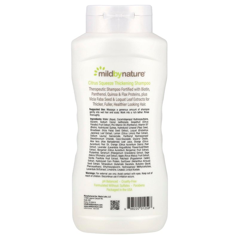 Mild By Nature Thickening Shampoo contains a B-complex and Biotin for thicker, fuller, and healthier looking hair. This shampoo is pH-balanced, cruelty-free and is formulated without sulfates, parabens or phthalates . Therapeutic Citrus Squeeze Thickening Shampoo is Fortified with Biotin, Panthenol, Quinoa, Flax Proteins, Vicia Faba seed, and Loquat Leaf Extract.