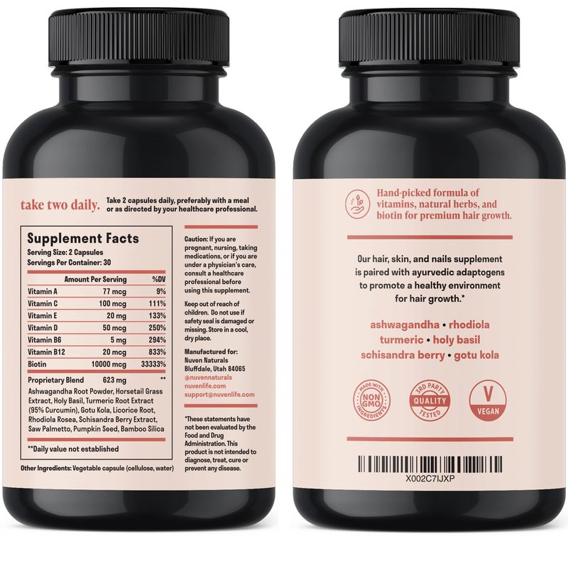 This unique combination of biotin, adaptogens, multivitamins, minerals, and hair essentials works together to promote hair support. The 17 ingredients found in Nuven Naturals hair vitamins - including Biotin, Horsetail & Saw Palmetto.* What’s inside our hair, skin, and nail support? Biotin: supports hair, skin, and nails. Helps deficiencies by targeting the structural framework your body uses to build on for overall hair, skin, and nails health.* Vitamins: A, C, E, B6, and B12 - all bundled together to support hair and nails . Hand-picked multivitamins that may help enhance oxygen to your scalp to support natural hair and help boost collagen in your body.* Adaptogens: These six organic adaptogens may help support mood and energy.* Natural Hair Formula* 60 Capsules | 30 Day Supply Other searches and names: best biotin supplement for hair growth women, biotin supplements for hair growth women, biotin vitmains for hair growth, biotin hair growth vitamins, biotin collagen supplements, biotin and collagen supplements.