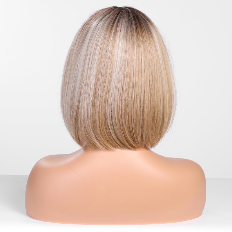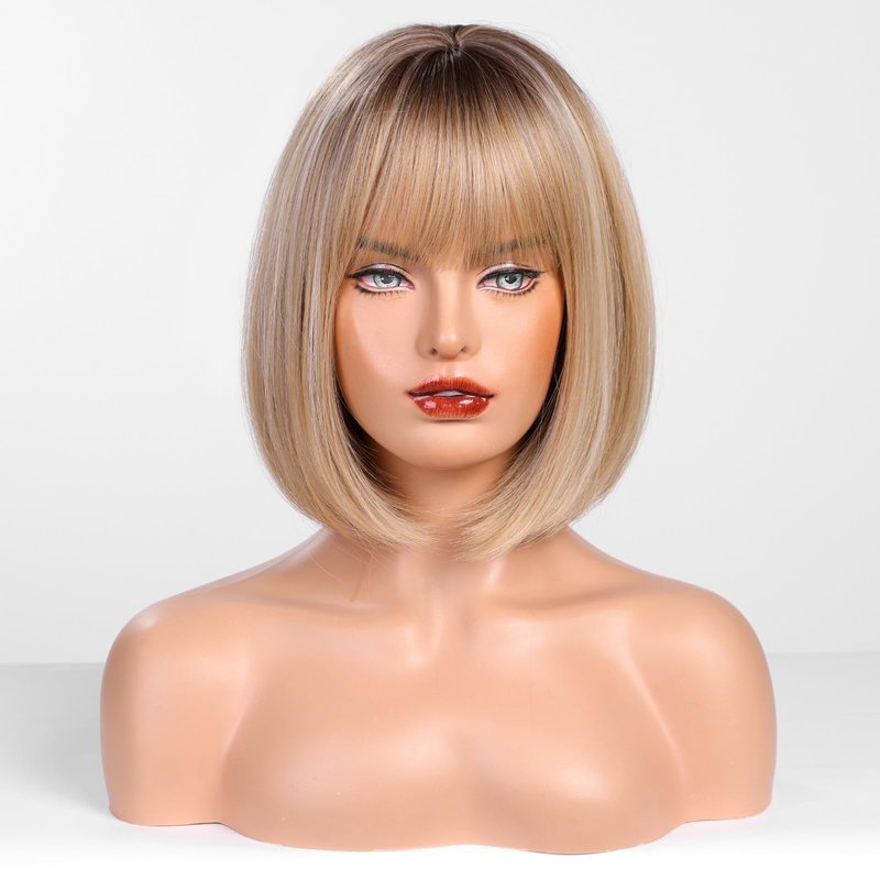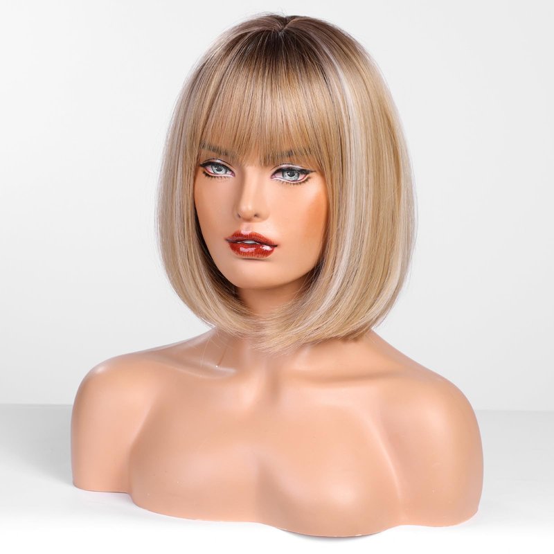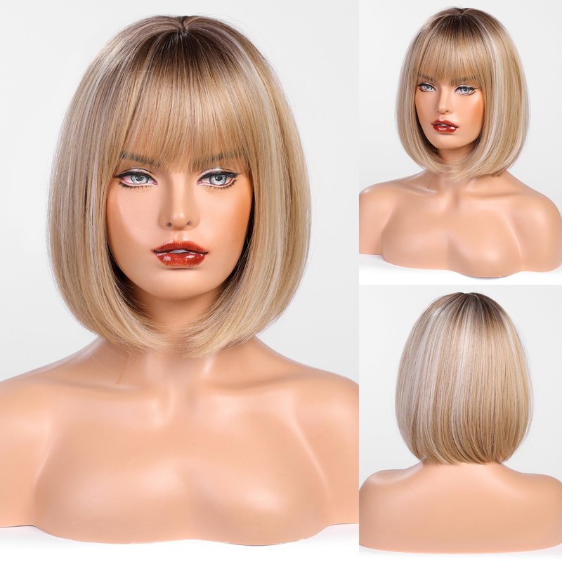 HAIRCUBE Bob Wig Short Ombre Blonde Wig with Bangs,Shoulder Length Synthetic Wigs for Women,Highlight Wigs for Daily Use