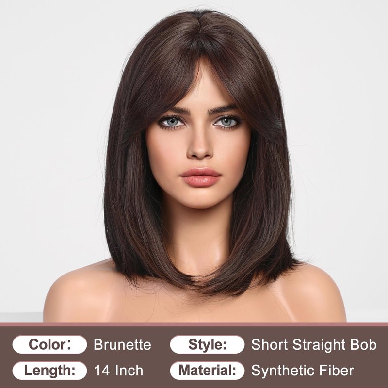 - Use and color:Whether it's the length or the dark brown color, this is a natural and classic hairstyle with bangs that can also be parted in the middle or worn as curtain bangs for a variety of formal or informal occasions.