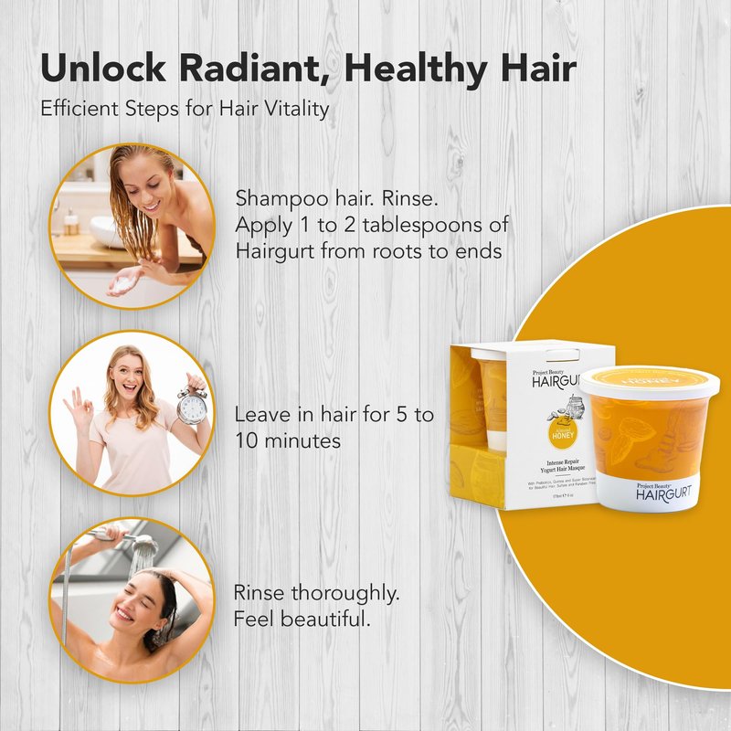 Discover the solution for healthier, more radiant hair with Hairgurt Intense Repair Yogurt Deep Conditioner Treatment Hair Masque. Our hair mask offers deep hydration and repair for damaged, bleached, colored, or frizzy hair. Say goodbye to dryness and hello to beautifully revitalized locks with this deep moisture hair mask. Achieve salon-quality results with this universal hair conditioning mask. It defies conventions with its lightweight formula that delivers heavyweight results, leaving brittle hair a thing of the past. Experience pure and gentle care with a hair mask for dry hair that also doubles as a heat damaged hair treatment. With no sulfates, parabens, harsh salt systems, and harmful colors and fragrances, this conditioner mask truly cares for your hair. Indulge in the enticing aroma of beauty with our deep hair mask, enriched with a botanical oil blend featuring pomegranate, raspberry, macadamia seed oil, yogurt protein, sweet almond, and quinoa. This regenerating hair mask not only helps repair split ends but also leaves your hair smelling like almonds and honey. Unveil the hair miracle with our protein hair treatment for damaged hair, meticulously crafted with high-protein yogurt, smoothing quinoa, and deeply hydrating botanical oils. Experience a hair mask repair that ensures a rejuvenated and shiny look, making you feel like a star. Elevate your hair care routine with Hairgurt Intense Repair Yogurt Deep Conditioner Treatment Hair Masque – the best hair mask for thicker, fuller hair, fortified with organic oils for bleached hair, protein, prebiotics, and anti-frizz benefits. Embrace the beauty and health of your hair like never before.