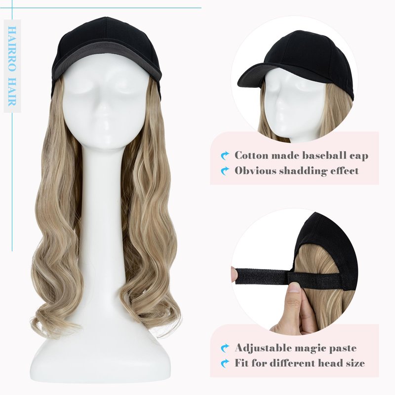 Hairro Baseball Cap with Hair Extensions Synthetic Hair Wig Baseball Hat with Hair Attached Adjustable Wave Hairpiece With Baseball Hat Cap Wig for Women #16P613 sandy blonde mix bleach blonde