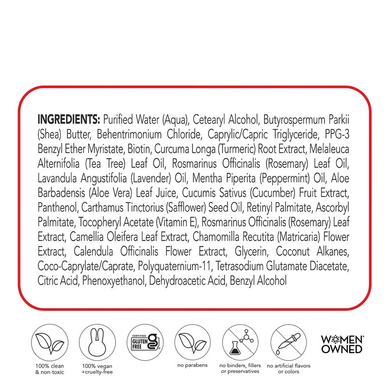 Say goodbye to hair breakage and say hello to healthy hair! Our Biotin and Botanicals Hair mask is infused with ingredients that can help strengthen and fortify the hair shaft. Experience the ultimate hair treatment for dry damaged hair, providing deep conditioning to reduce frizz and smooth hair. Safe to use on color-treated hair. This Deep Conditioning Hair Mask gives you greater shine and promotes more beautiful hair. What's inside? BIOTIN: Known as THE hair-loving ingredient, this essential vitamin can help strengthen and thicken hair while preventing breakage and hair loss. SHEA BUTTER: Provides intense hydration and shine to dry, coarse, and frizzy hair. TURMERIC: Helps reduce breakage and hair fall while protecting against environmental stressors. ROSEMARY: Known for its soothing properties, can help dry, damaged hair while promoting hair growth and scalp health.
