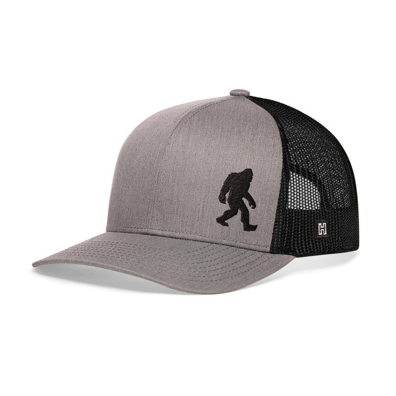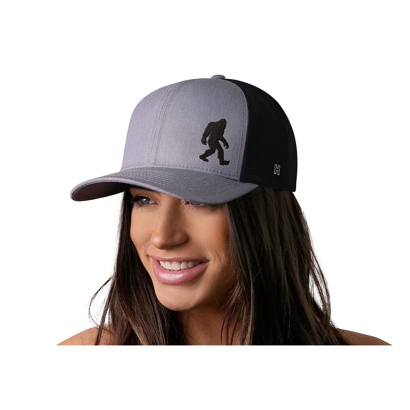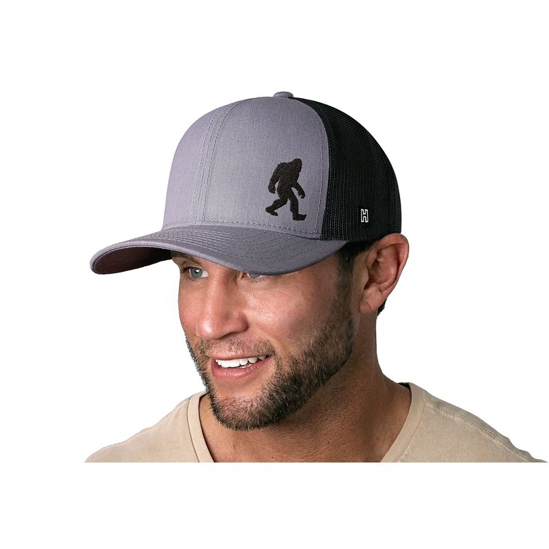 - TRUCKER HAT IN GREY & BLACK: This is a grey & black hat that will never go out of style. It's also the perfect beach hat or summer hat, and protects from the sun. You'll love it if you are looking for a bigfoot gift, sasquatch gift, sasquatch hat or a bigfoot hat.