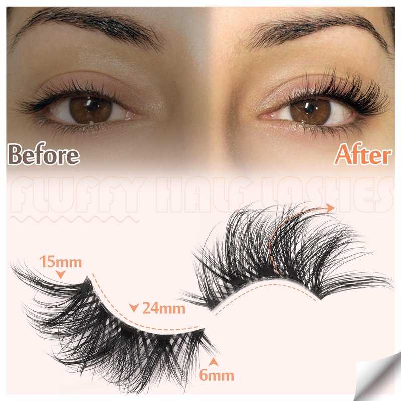 - 【Idea for Different Makeup Style】You can choose to wear wispy eyelashes strips to create a natural look. Fluffy half lashes are also perfect for creating cute foxy eye makeup for nights out and parties. Let the same half eyelashes make different looks for you!