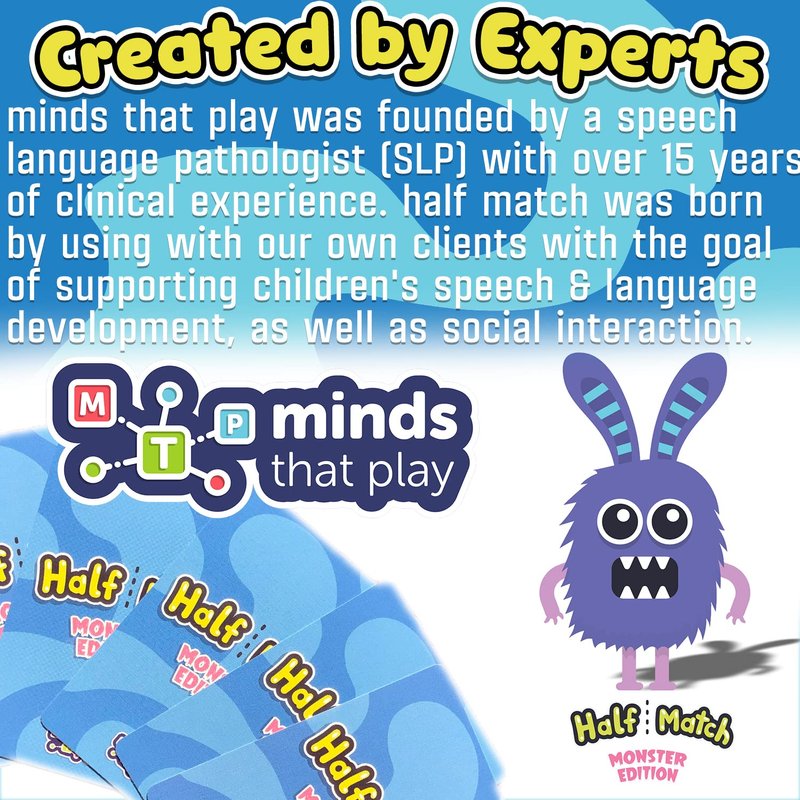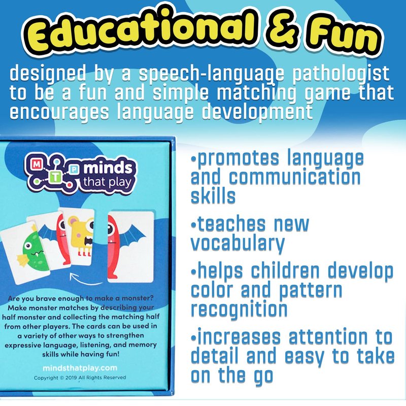 - A Proud US Small Business — parents looking for games that are fun and educational can look to Minds that Play's Half Match: Monster Edition, developed by a speech-language pathologist. It is designed to support children's speech and language development and social interaction