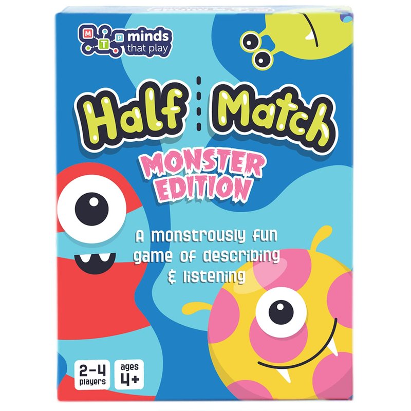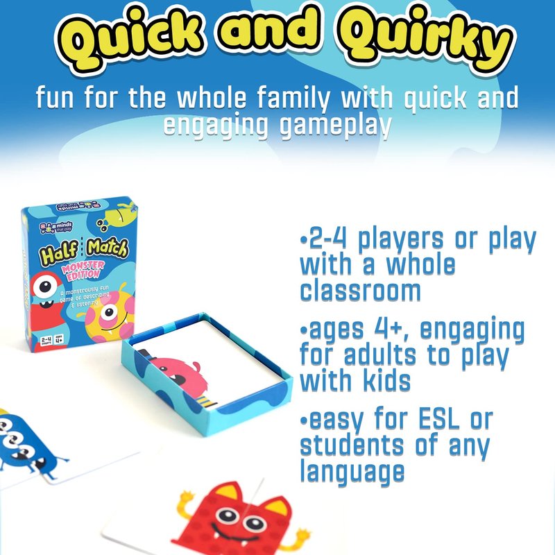 Half Match: Monster Edition A Monstrously Fun Game Children love to match things! With this in mind, we created a fun game with 22 quirky & loveable monsters. Half Match: Monster Edition was designed by a speech language pathologist to be a fun & simple matching game that encourages language development. Multiple Ways to Play We designed Monster Edition to allow two game types. Both games allow children to build on such skills as memory, color/pattern recognition, listening, & language skills. Game one involves collecting as many missing halves of your monsters as possible from other players. Players must describe their half monsters to other players. Opponents must guess the correct card in their hand. If you guess right, you claim it. The winner is the player that can collect the most monsters. Game two involves a traditional matching game with monster cards set up in rows. Players take turns guessing a match. The winner is the person guesses the most complete matching monsters. Educational & Fun for The Whole Family! A fun game for ages 4 & up. Two to four players can enjoy. Adults can get in on the fun as well! Schools love it too! Get multiple sets for a great classroom activity! Key Educational Benefits: -Promotes language & communication skills -Teaches new vocabulary - memory games for kids ages 4-8, memory games for kids 8-12, memory games for kids ages 3-5, toddler memory game, memory games for kids free, dinosaur memory match game, match game for kids ages 4-8, magnetic animals for toddlers mix and match, chime express memory 10, toddler memory book, memory board, wooden memory gameHelps develop color & pattern recognition -Increases attention to detail -Develops social skills