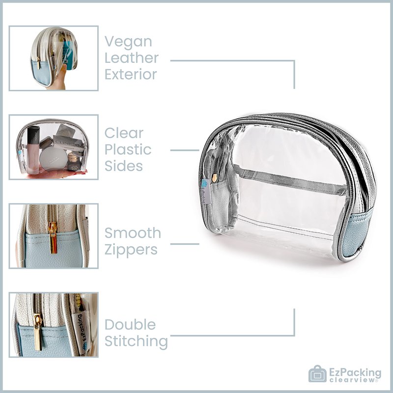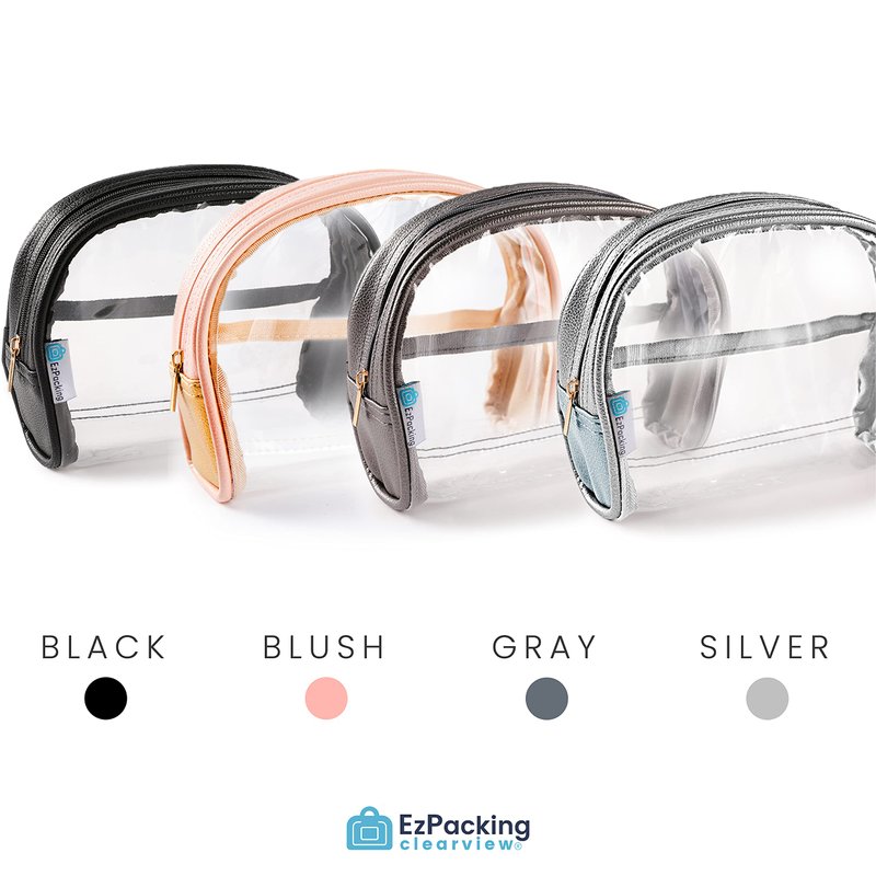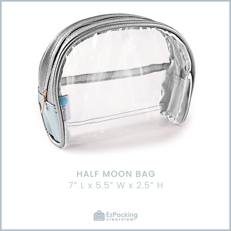 Clear Makeup Bag: Our clear half moon pouch can fit 7 to 8 cosmetics. Works great for when you’re traveling or if you need to keep your beauty items organized on the go. The plastic sides are easy to clean in case your liquid foundation leaks.