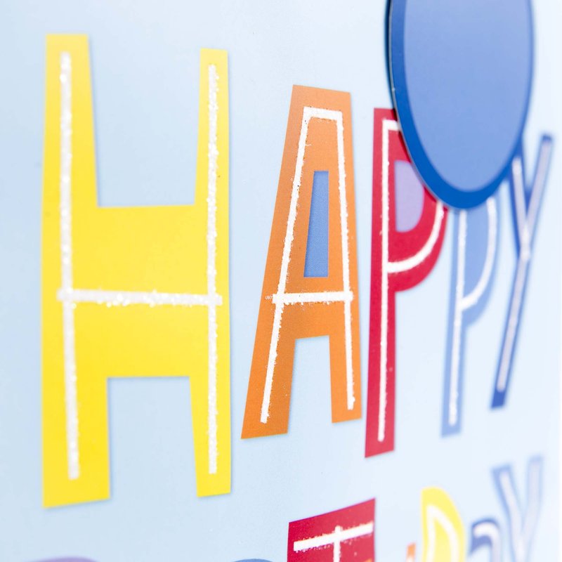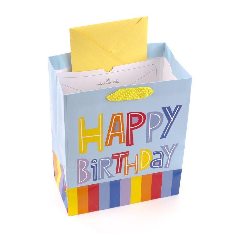 - This cheerful birthday gift bag features multicolored "Happy Birthday" lettering on a light blue background with colorful stripes along the bottom. Glitter accents, a white polka dot on yellow ribbon handle, and a round, blue gift tag complete the package.