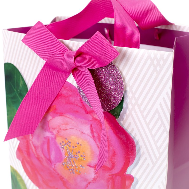 - Pretty and feminine medium paper gift bag with tissue paper features a subtle striped pattern background with a prominent blooming pink rose design, glitter accents and vibrant pink ribbon bow. Includes 2 sheets of pink tissue paper and a pink glitter gift tag to make wrapping quick and easy.