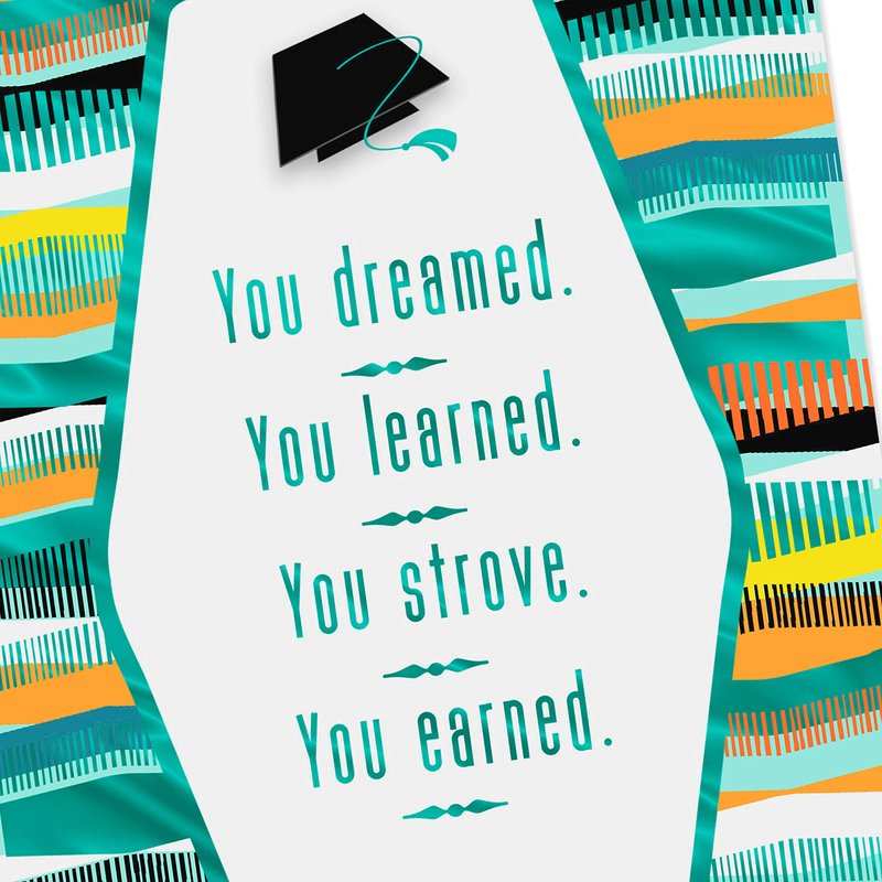 - Card pack includes 6 cards in a single design featuring a mortarboard and diploma on a colorful patterned background, accented with metallic foil. Inside reads: "It really does pay to work hard, doesn't it? Congratulations!"