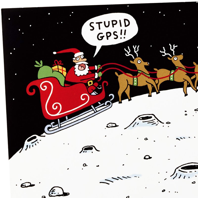 - Holiday cards feature four humorous designs. Inside message for each design: Santa on the moon reads, “Find yourself a Merry Christmas!” Three Wise Men reads, “Hope you get extra everything for Christmas!” Pinterest birds reads, “Hope your holidays are decorated with happiness.” Dancer at the dance competition reads, “Have fun dancing through the holidays.”