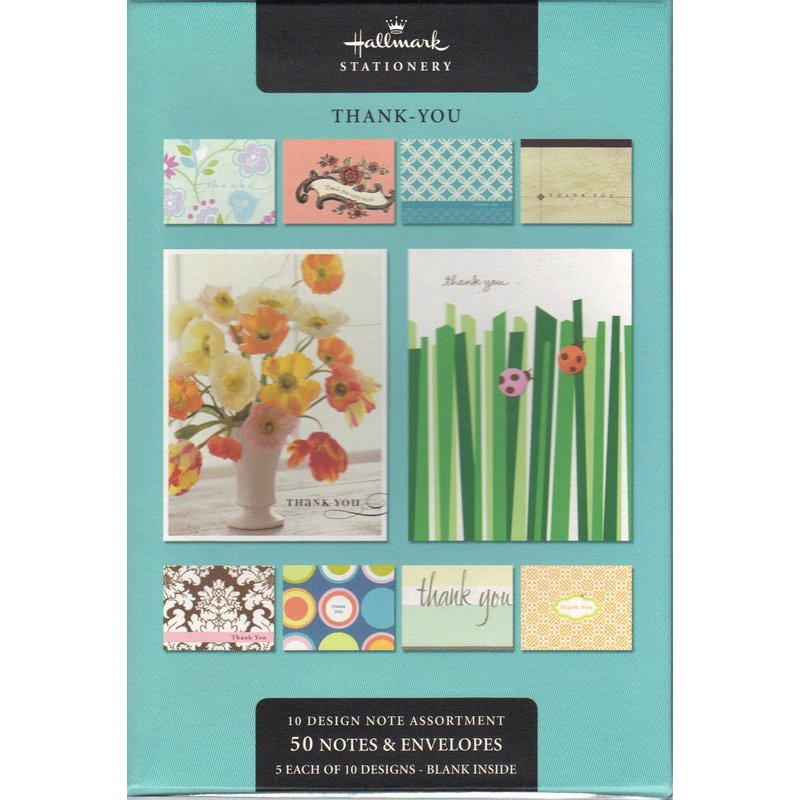 HALLMARK STATIONERY Thank You Cards (10 - Different designs: Stationary Cards) 1 Box includes - 50 Blank cards & 50 Envelopes: (5 Each of 10 Designs) (WTU8360)