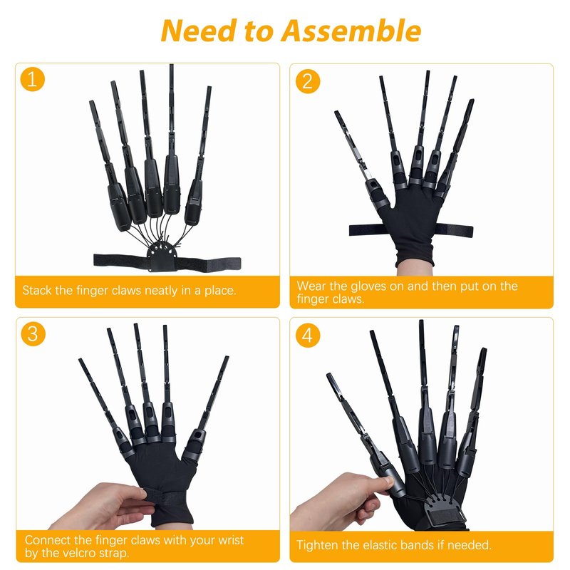 - 【Need to Assemble Finger Claws】:First, match the fingers to your real fingers. The middle 3 fingers are interchangeable since they are all the same size.The remaining two fingers, the thinner, shorter one is the pinky, and a thicker , shorter one is the thumb. Use the elastic bands to secure them to the frame with holes one by one.Then put the velcro on the frame and put your real fingers to the finger extensions one by one. Adjust the elastic cords, tying a knot, to make it fit your fingers.
