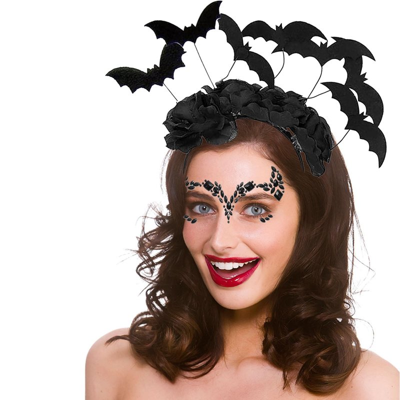 - Material:This Halloween headband is made of high-quality Fabric material, safe , soft and comfortable to wear, durable material can meet your needs for a long time.Bat costume face gems are made of rhinestone and acrylic diamond, very shiny and sparkling.