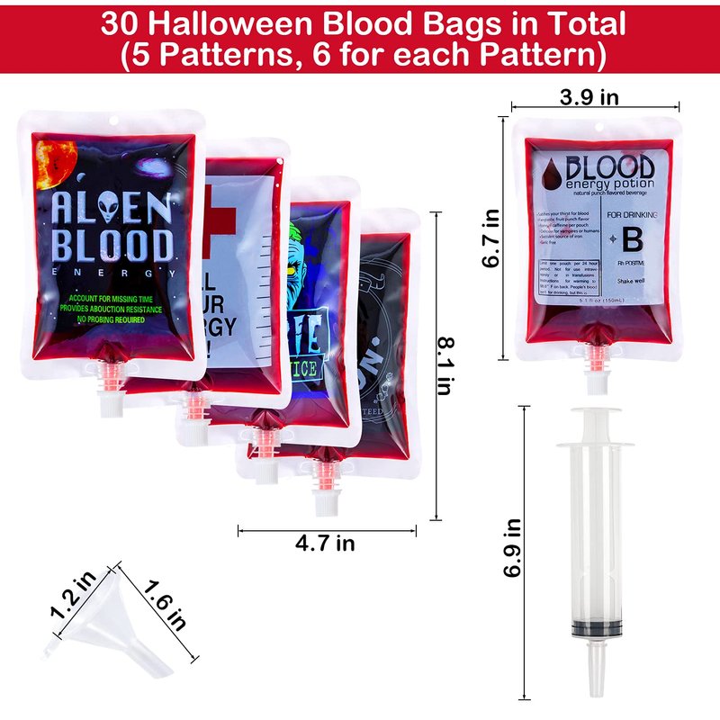 - 5 Different Patterns of Halloween party favors: The Halloween decorations drink pouches come with 30 pack assorted Halloween blood bags in 5(zombie, aliens, poison, red cross, blood B)different Halloween theme patterns, each pattern with 6pcs and 2 Funnels, 6 Syringe. These Halloween Blood Bags Party Supplies make a great accessory to your vampire costume to entertain guests at your Halloween party with these fun blood bags!