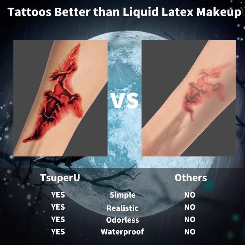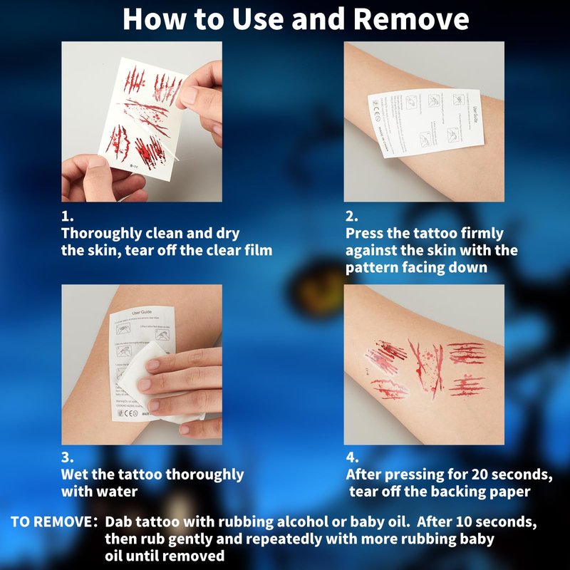 - Easy to apply and remove tattoo: choose the pattern you like, cut it out, peel off the surface protective film, make sure your skin stays dry, stick it on the skin and moisten the sticker with water, wait for 10 seconds, then peel it off. Realistic Halloween fake wounds are displayed right on your skin. If you want to remove fake tattoos, fake Halloween scars can be easily removed with baby oil, household alcohol, or olive oil