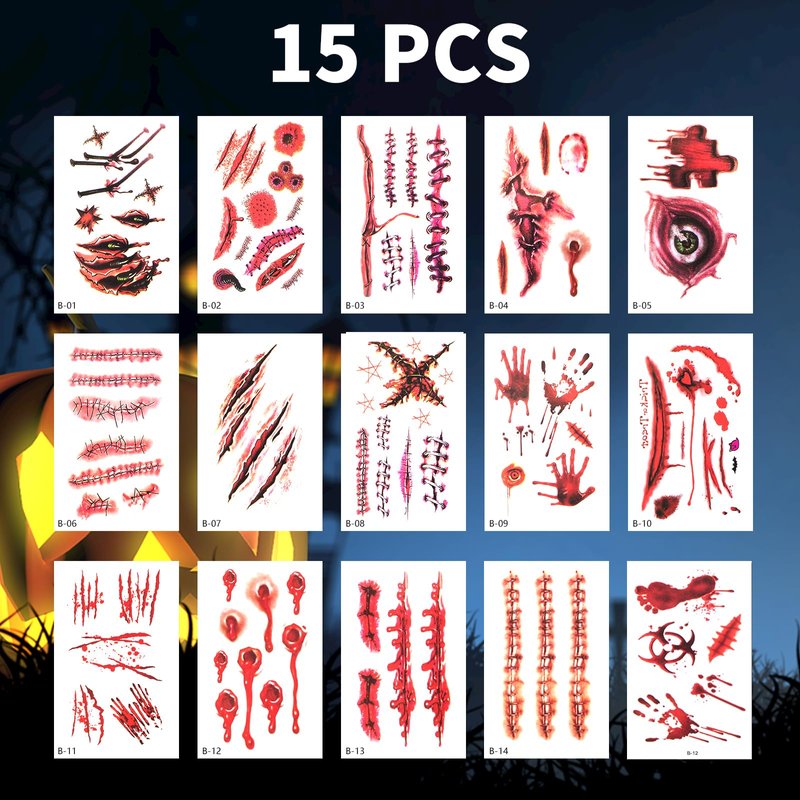 - Spooky Halloween decorations: The Halloween sticker set has 15 sheets in total, with more than 30 patterns, including various scars and wounds, bloody handprints, blood holes, devil's claws, halloween face stickers and other scary patterns, which are perfect for decorations Halloween costumes for women and men, clown vampire zombie makeup Halloween accessories party favors carnival decorations