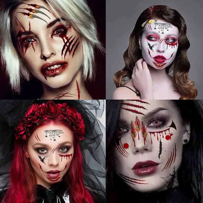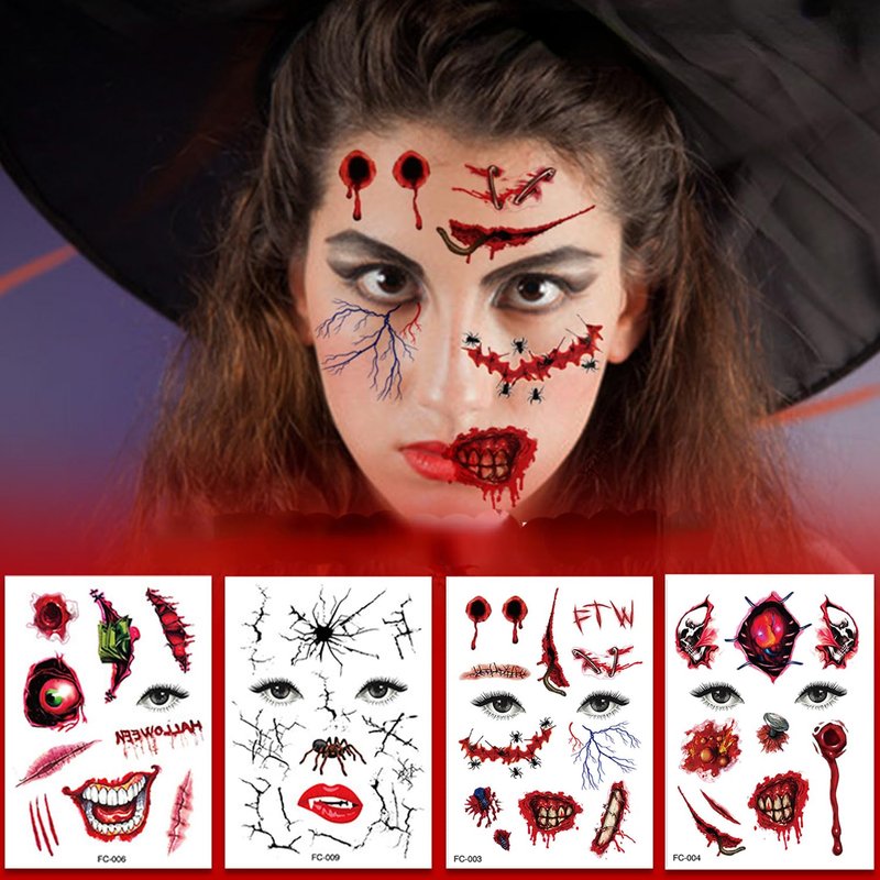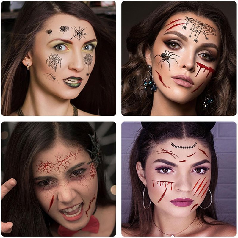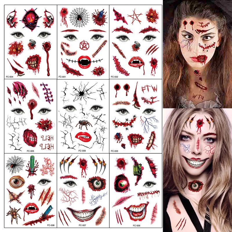 - 【Horror Halloween】-- Get ready to transform into a terrifying character at your Halloween party with our 3D effect horror face temporary tattoos! This set of nine spine-chilling tattoos includes bleeding wounds, scratch marks, spider webs, spooky eyeballs, bullet wounds, and more, guaranteed to make you the center of attention!